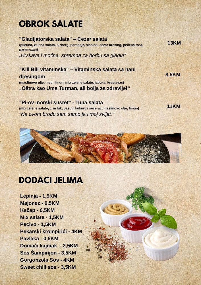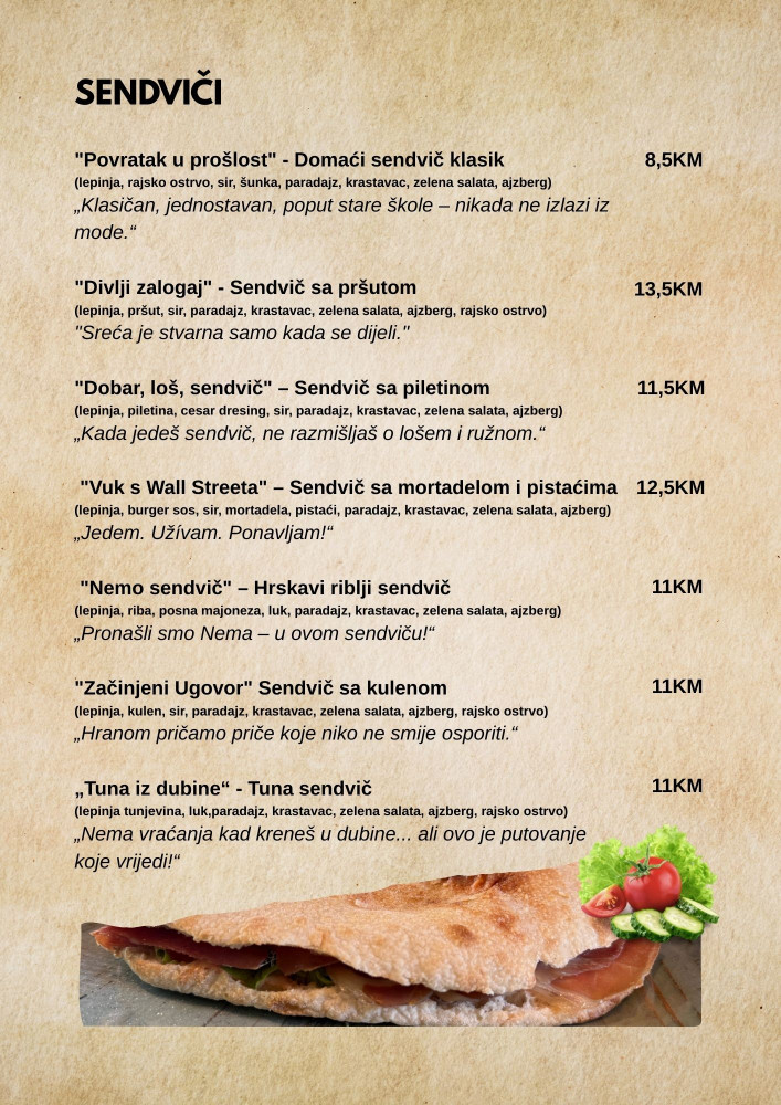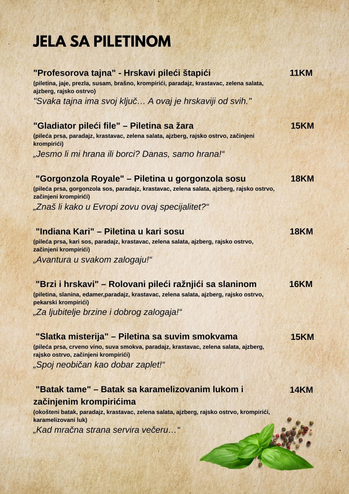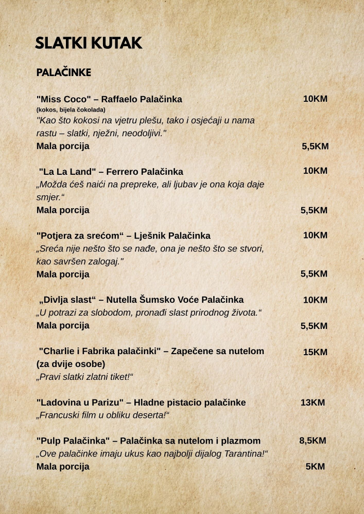 Ljubitelji mesa mogu probati "Gladiator pileći file", "Indiana Kari", ali i burgere poput "Titanik burgera" ili "Gurmanskog Gatsbyja". Posebnu pažnju privlači "Pljeskavica za spas", dok su za sladokusce pripremljene palačinke kao što su "La La Land", "Into the Wild" i "Charlie i Fabrika palačinki".
