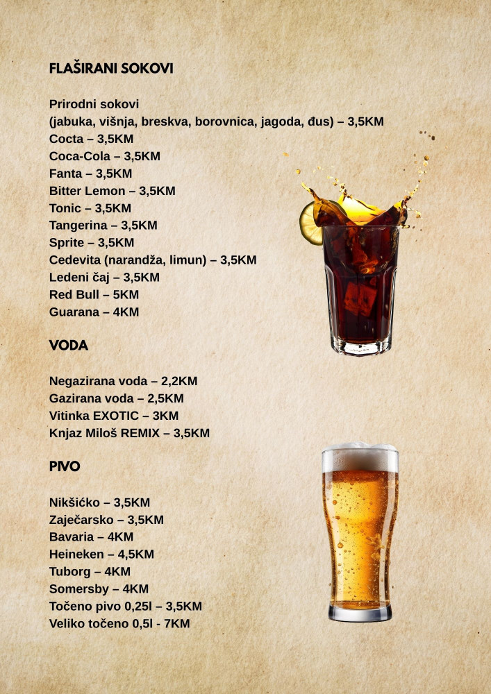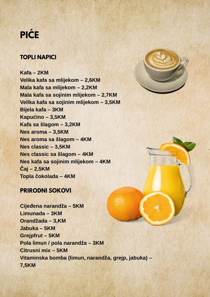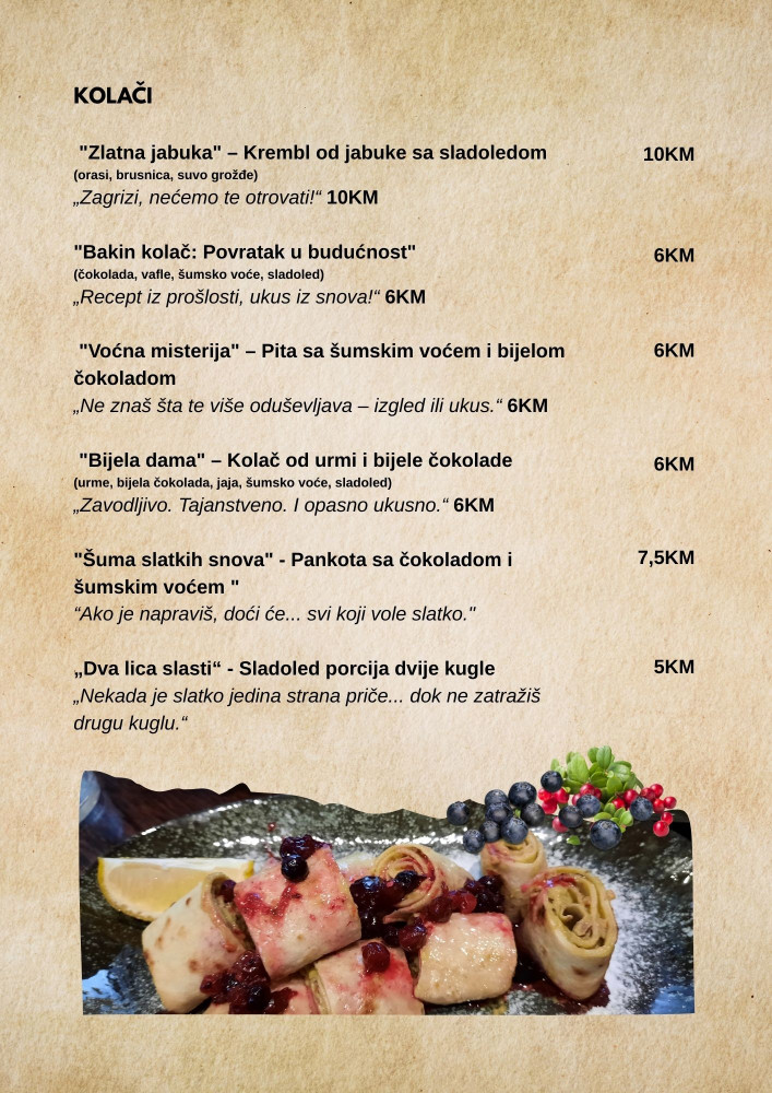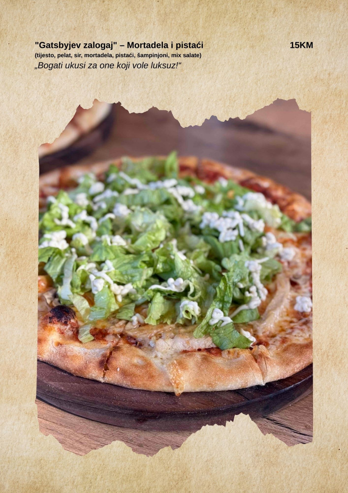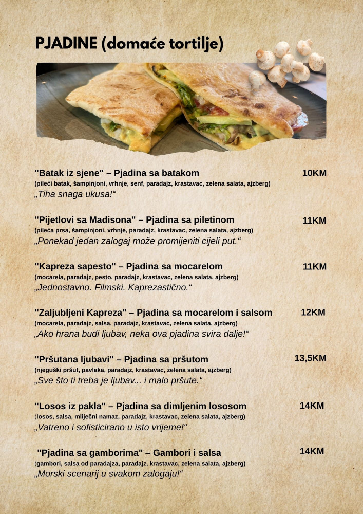 Ljubitelji mesa mogu probati "Gladiator pileći file", "Indiana Kari", ali i burgere poput "Titanik burgera" ili "Gurmanskog Gatsbyja". Posebnu pažnju privlači "Pljeskavica za spas", dok su za sladokusce pripremljene palačinke kao što su "La La Land", "Into the Wild" i "Charlie i Fabrika palačinki".