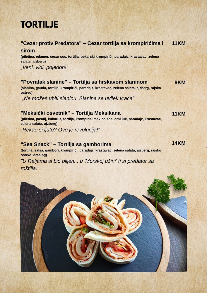 Za ljubitelje tortilja i pjadina tu su "Cezar protiv Predatora", "Povratak slanine", "Losos iz pakla" i mnoge druge kombinacije ukusa.