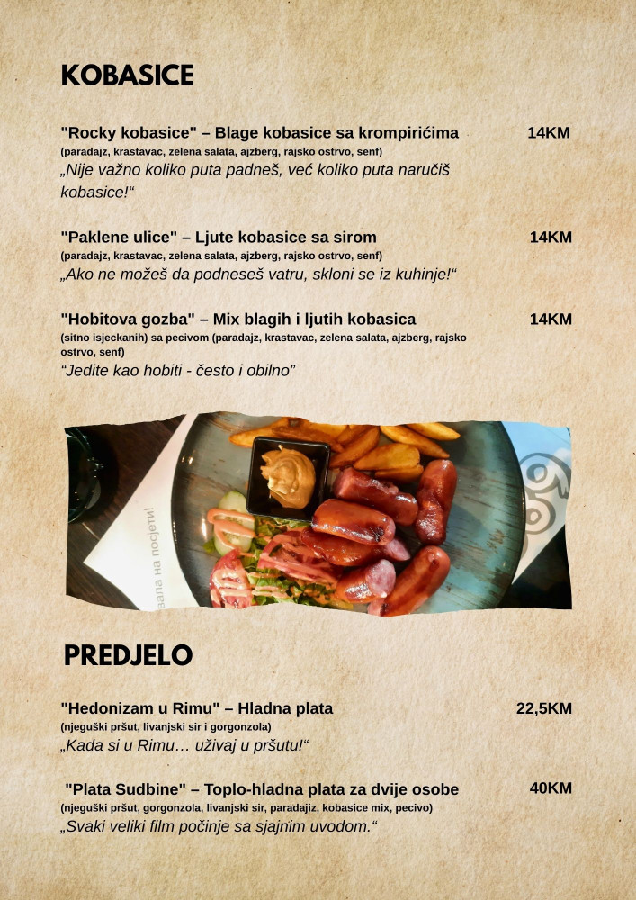 Meni nudi i posna jela, bogate obrok salate, predjela i deserte, a svako jelo dolazi sa citatom koji ga povezuje sa filmom po kojem je dobilo ime.