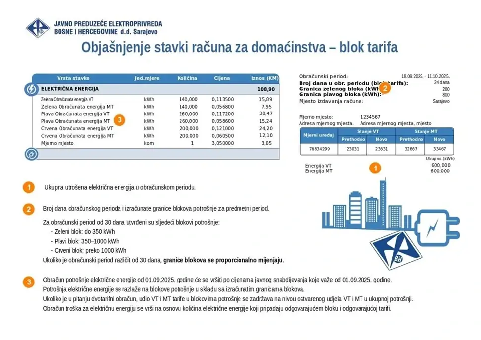 Javno preduzeće Elektroprivreda Bosne i Hercegovine d.d. Sarajevo objavilo je detaljno pojašnjenje načina obračuna električne energije po sistemu blok tarifa.