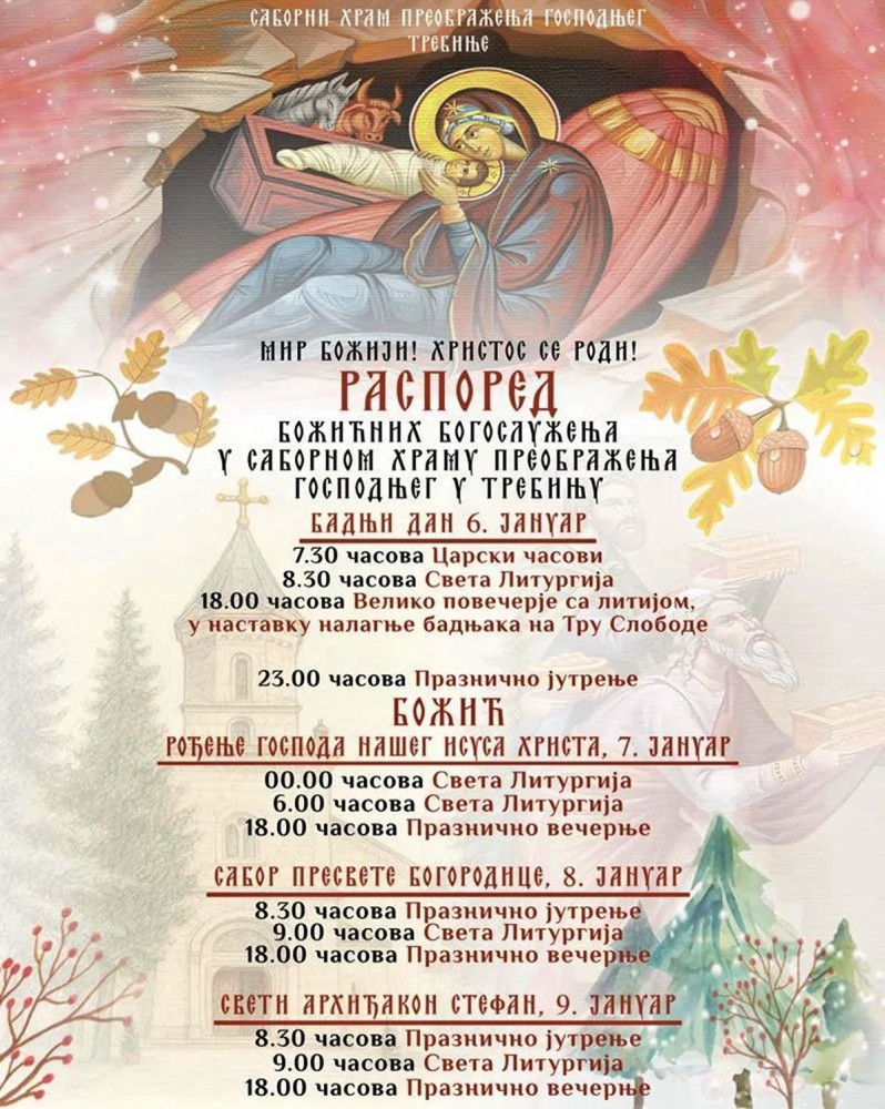 Божићна литургија ће у Саборном храму бити служена у поноћ, затим у 6.00 часова, а у 18.00 часова ће бити служено празнично вечерње.