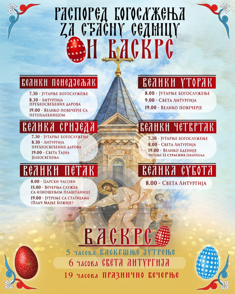 Na Vaskrs, najveći hrišćanski praznik, jutrenje počinje u 05.00 časova, liturgija je u 06.00, a praznično večernje će biti služeno od 19.00 časova.