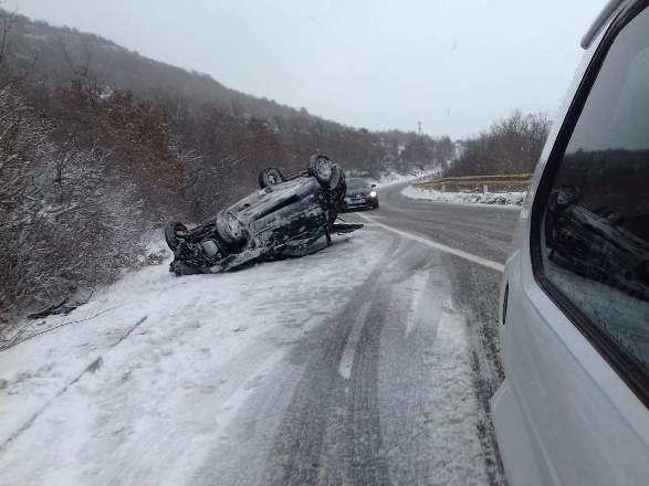 Vozilo se na putu prevrnulo na krov i uviđaj je u toku. Zbog snježnih padavina i mećave na području cijele istočne Hercegovine, iz preduzeća "Hercegovina putevi" Trebinje upozoravaju vozače na opreznu
