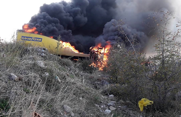 Šleper za sada nepoznatog prevoznika, koji je prevozio voće i povrće, sletio je sa puta prilikom spuštanja na nizbrdici. Teretno vozilo se potom zapalio i u potpunosti izgorjelo, a vozač je poginuo.