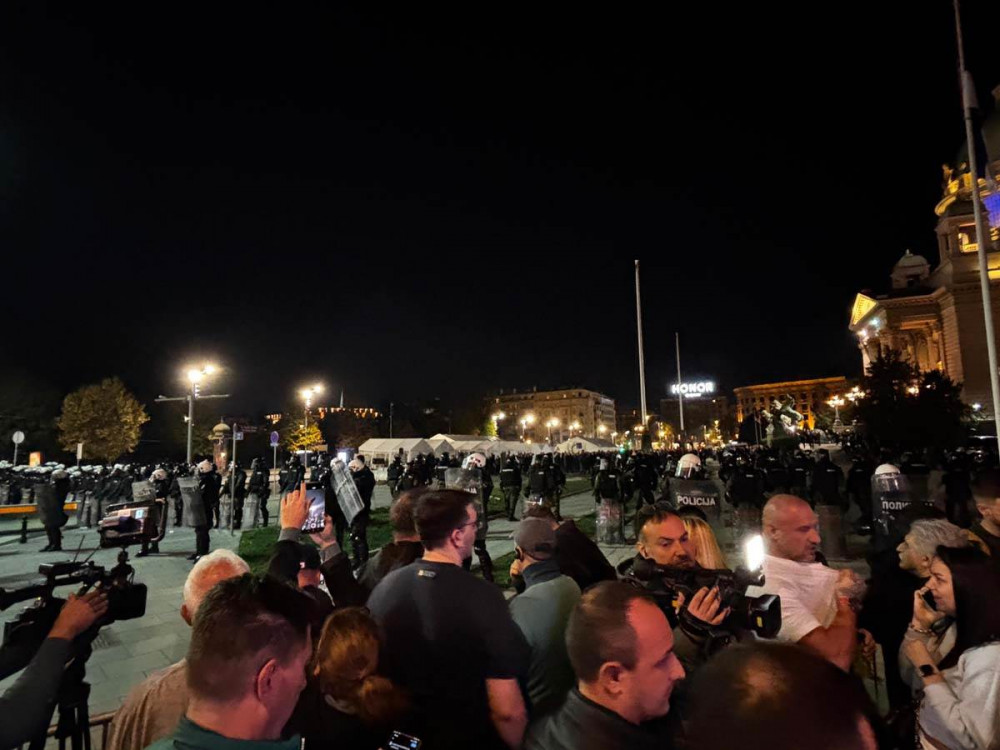 Pripadnici policijske brigade i Žandarmerije spriječili su masovnu tuču dvije grupe građana koji su okupljeni na platou ispred Narodne skupštine u centru Beograda. Kordon policije stoji kod ograde koja stoji na uglu Takovske ulice i Bulevara kralja Aleksandra između građana koji podržavaju Dijanu Hrku, majku Stefana Hrke koji je poginuo u padu nadstrešnice Željezničke stanice 1. novembra 2024. u Novom Sadu, i građana koji se nalaze u kampu koji se nalazi ispred Skupštine Srbije.