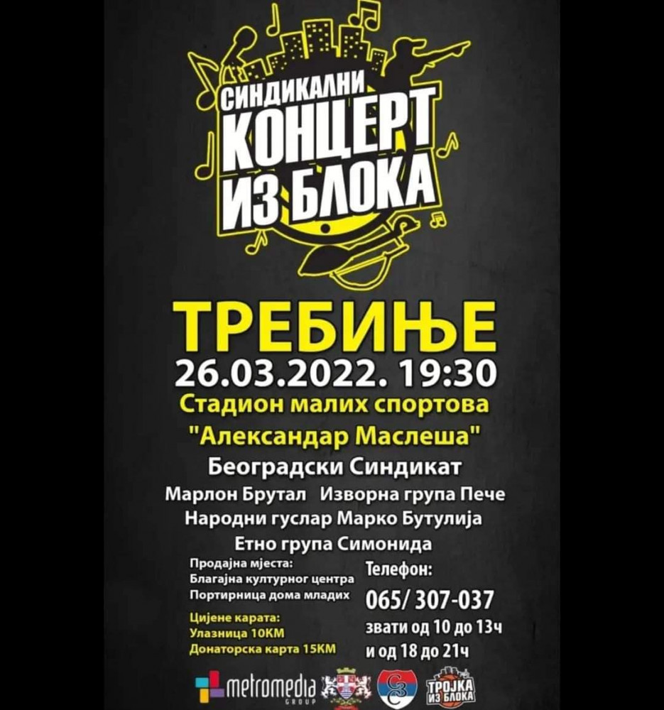 На стадиону малих спортова "Александар Маслеша" у Требињу, 26. Марта у 19:30 часова, биће одржан "Синдикални концерт из блока" хуманитарног карактера.