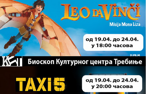 Наредних дана, од 19. до 24. априла требињска публика има прилику да ужива у два нова филмска остварења у биоскопу Kултурног центра – Таxи 5 и Лео Да Винчи: Мисија Мона Лиза.