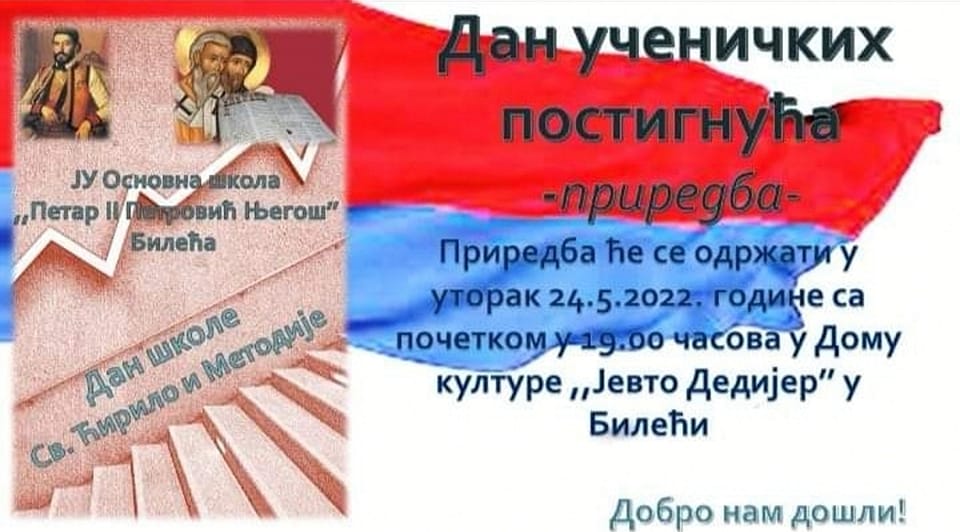 Основна школа "Петар II Петровић Његош", поводом Дана школе организује приредбу "Дан ученичких постигнућа". Приредба ће бити одржана у Дому културе "Јевто Дедијер" сутра (уторак, 24.мај) са почетком у 19.00 часова.
