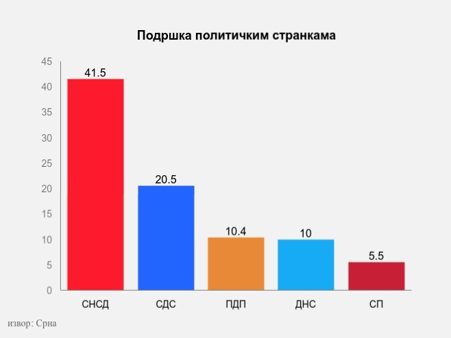 Истраживање јавног мњења које је рађено за једну међународну организацију у БиХ, а коју је радила реномирана агенција крајем августа на узорку од 2.000 испитаника у Републици Српској, показује да би 41,5 одсто анкетираних дало подршку СНСД-у, док би СДС добио 20,5 одсто гласова.