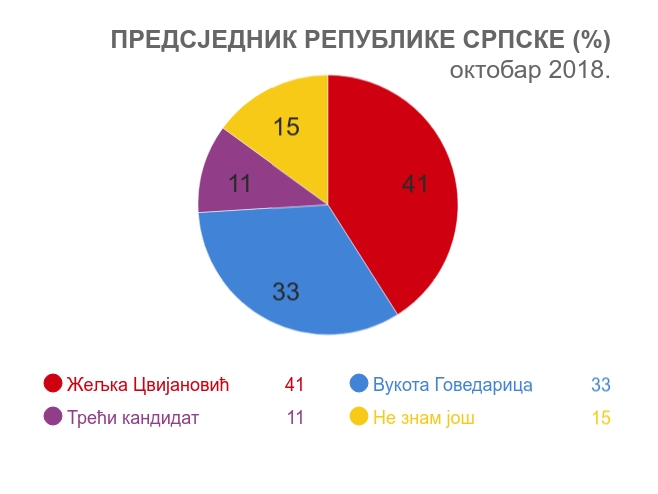 Према овом истраживању, које посједује РТРС, нови предсједник Републике Српске биће Жељка Цвијановић, која ће у односу на Вукоту Говедарицу имати од 35 до 50 хиљада гласова више.