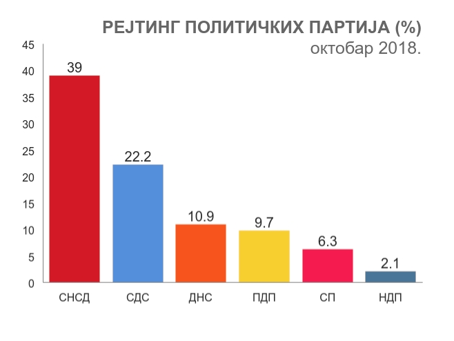СНСД има 39 одсто, СДС 22,2 одсто подршке, ДНС 10,9, ПДП 9,7, Социјалистичка партија 6,3 одсто.