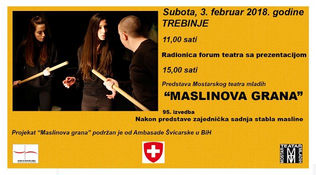 U 15 časova glumci Mostarskog Teatra Mladih (MTM) odigraće “Maslinovu granu”, tematsku predstavu koja je igrana širom Evrope, a ovo će joj biti 95.izvođenje. Predstava se bavi problematikom različitosti i predrasuda kod mladih.  Ulaz je slobodan.