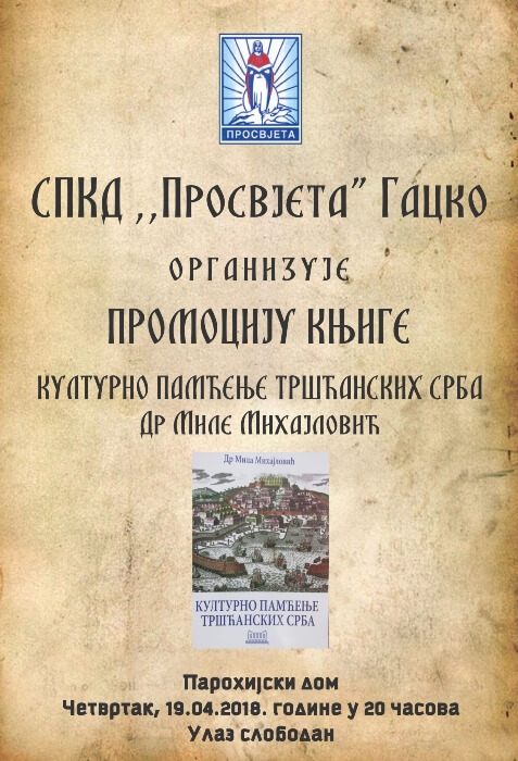 U organizaciji SPKD „Prosvjeta“ Gacko, u četvrtak 19. aprila, sa početkom u 20 časova, u sali parohijskog doma u Gacku biće predstavljena knjiga „Kulturno pamćenje tršćanskih Srba“, autora dr Mile Mihajlović.
