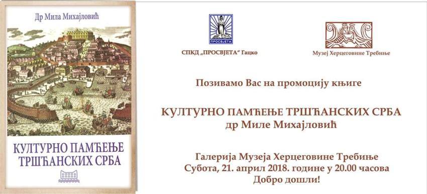 Након промоција у Гацку и Мостару књига „Културно памћење тршћанских Срба“ аутора др Миле Михајловић биће одржана у Требињу у суботу, 21. априла у Галерији Музеја Херцеговине у 20 часова.