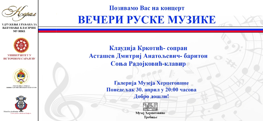 U ponedjeljak, 30. aprila, u Galeriji Muzeja Hercegovine održaće se Veče ruske muzike, na kojoj će nastupiti Klaudija Krkotić-sopran, Astašev Dmitrij Anatoljevič-bariton i Sonja Radojković-klavir.
