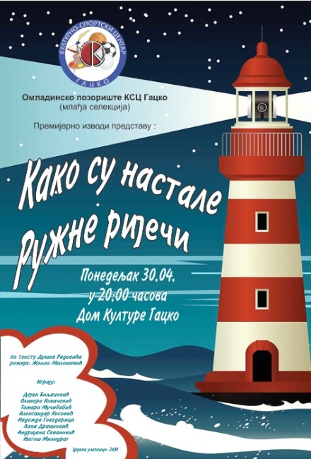 U Domu kulture u Gacku će u ponedjeljak, 30. aprila, biti premijerno izvedena predstava „Kako su nastale ružne riječi“ Omladinskog pozorišta Gacko.