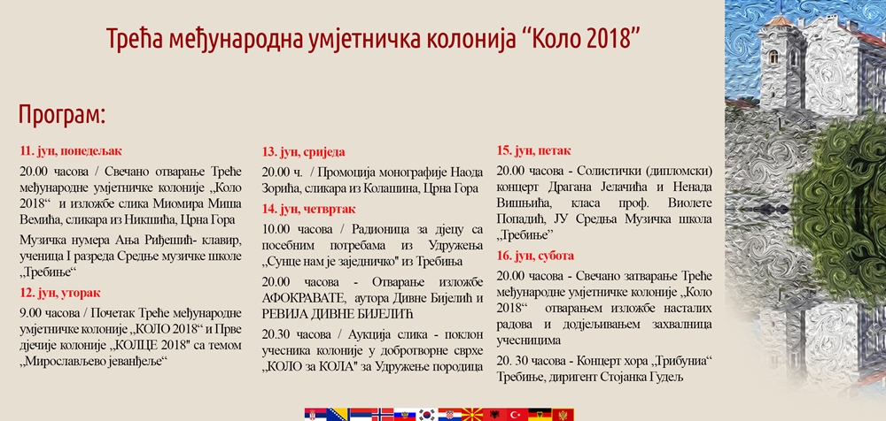 Трећа међународна ликовна колонија „КОЛО 2018“ одржава се у оквиру Требињског културног љета, чији је покровитељ Град Требиња.