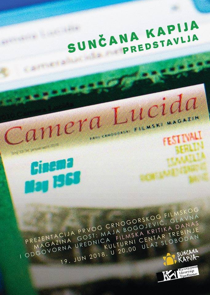Prezentacija prvog crnogorskog filmskog magazina „Camera Lucida“održaće se u galeriji Kulturnog centra Trebinje u utorak, 19. juna, sa početkom u 20 časova, u organizaciji Udruženja „Sunčana kapija“.