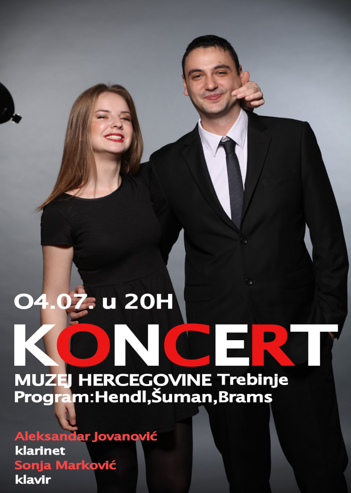 U Muzeju Hercegovine će, u srijedu 4. jula biti održan koncert Sonje Marković (klavir) i Aleksandra Jovanovića (klarinet). Koncert počinje u 20 časova.