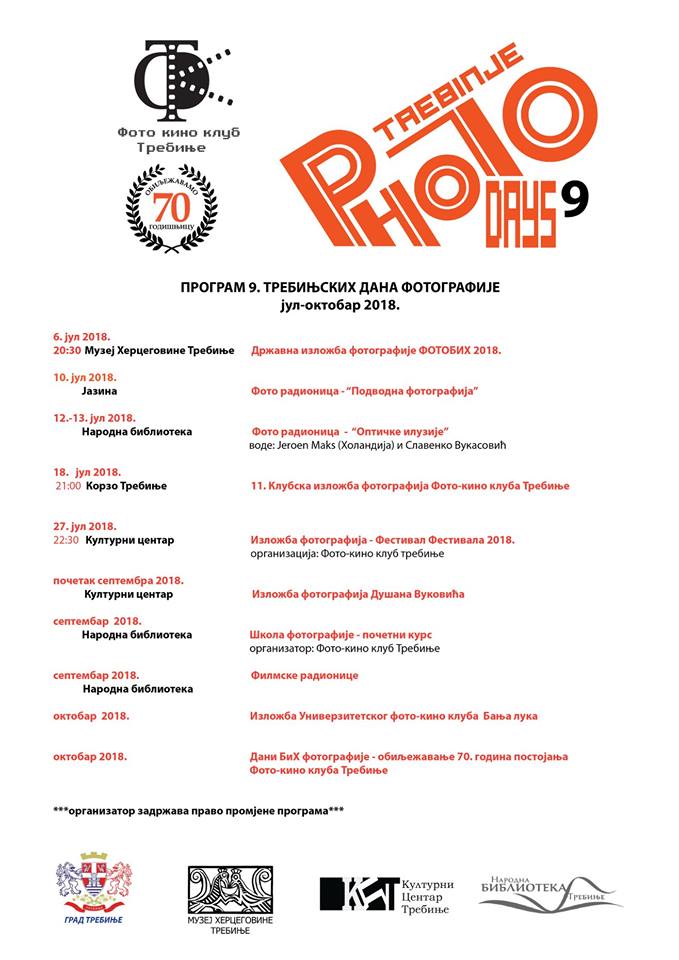 I za ovogodišnje „Trebinjske dane fotografije“ organizatori najavljuju sadržajan program – od samostalnih i kolektivnih foto izložbi, preko škole fotografije za početnike, do foto i filmskih radionica, a trajaće sve do oktobra, kada je planirano da posebnom svečanošću bude obilježen značajan jubilej trebinjskog Foto kino kluba – 70 godina od osnivanja.