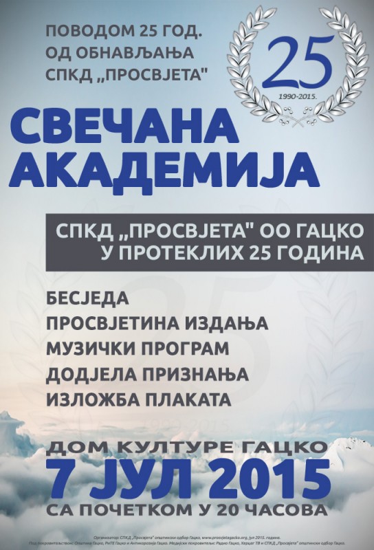Свечана академија поводом 25. године од обнављања СПКД "Просвјета" одржаће се у Дому културе у Гацку са почетком у 20 часова.