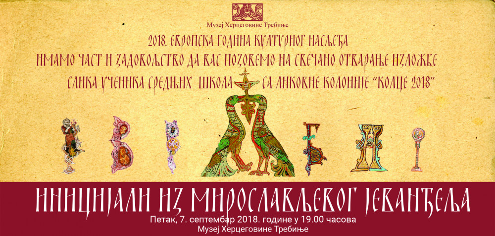 Свечано отварање изложбе слика „Иницијали из Мирослављевог јеванђеља“, ученика средњих школа са ликовне колоније „КОЛЦЕ 2018“ одржаће се у Музеју Херцеговине Требиње сутра, 7. септембра са почетком у 19 часова.