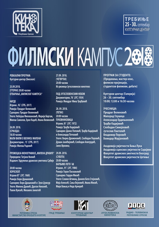Tradicionalni „Filmski kampus “ koji Kinoteka Srpske organizuje od 25. do 30. septembra,  biće održan u Trebinju,  uz učešće tridesetak studenata iz Republike Srpske, BiH, Srbije i Crne Gore, te istaknutih filmskih umjetnika, pedagoga, istoričara filma i filmskih arhivista iz regiona.