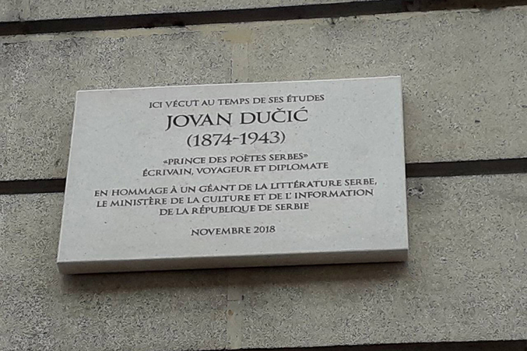 "Ovdje je u vrijeme svojih studija živio Jovan Dučić (1874-1943), knez srpske poezije, pisac, putopisac i diplomata. U spomen na velikana srpske književnosti, Ministarstvo kulture i informisanja Republike Srbije, novembra 2018. godine".