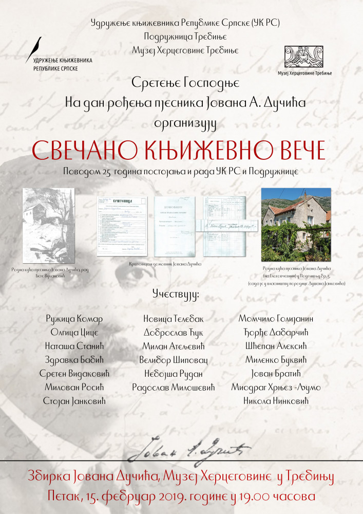 Удружење књижевника Републике Српске и Подружница Требиње, у сарадњи са Музејом Херцеговине Требиње, поводом 25 година постојања и рада, на Сретење Господње и на дан рођења пјесника Јована Дучића организују Свечано књижевно вече.