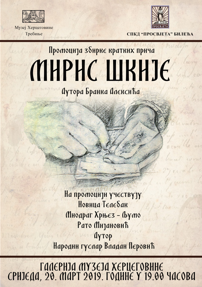 U Galeriji Muzeja Hercegovine u Trebinju u srijedu, 20. marta biće promovisana knjiga Branka Aleksića "MIRIS ŠKIJE".