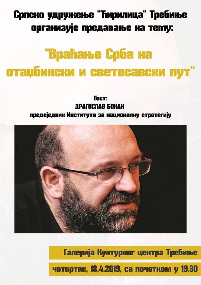 У галерији Културног центра Требиње, вечерас са почетком у 19.30 часова, српски режисер, књижевник, публициста и предсједник Института за националну стратегију из Новог Сада Драгослав Бокан одржаће предавање на тему "Враћање Срба на отаџбински и светосавски пут".
