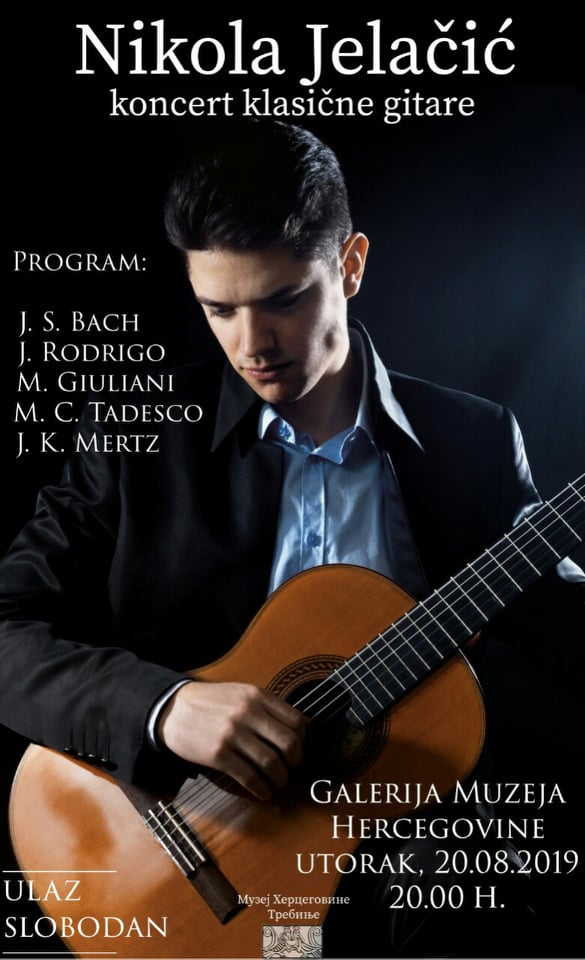 Koncert klasične gitare Trebinjca Nikole Jelačića održaće se u utorak, 20. avgusta 2019. godine u Galeriji Muzeja Hercegovine. Koncert počinje u 20:00 časova, a ulaz je slobodan. Dobrodošli.