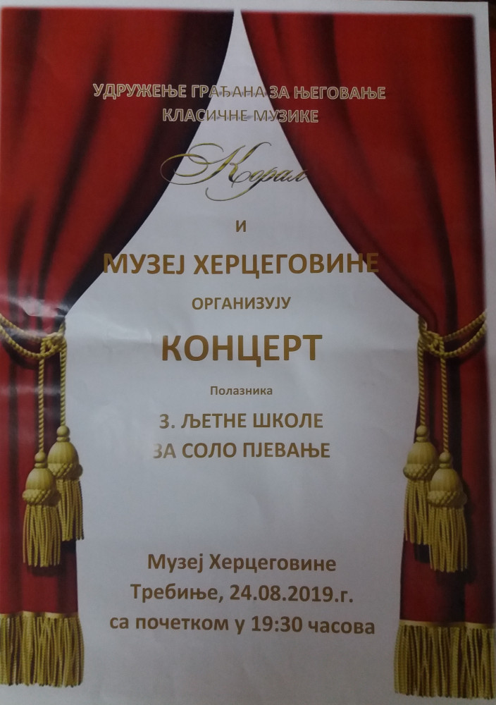 Kонцерт полазника Треће љетње школе за соло пјевање одржаће се у суботу, 24. августа 2019. године са почетком у 19:30 часова, у Галерији Музеја Херцеговине.
