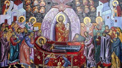 U trenutku smrti Bogorodice, kako je zapisano, apostoli počeše pjevati u slavu Božiju, a sva se soba zasja od čudne svjetlosti i presveta Đeva predade duh svoj u ruke Spasiteljeve ne osjetivši smrtnoga bola.