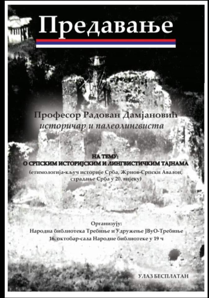 Народна библиотека Требиње у Удружење ЈВуО - Требиње организују предавање на тему: „О српским историјским и лингвистичким тајнама: етимологија – кључ историје Срба, Жрнов – Српски Авалон, страдање Срба у 20. вијеку“. Предавање ће одржати професор Радован Дамјановић – историчар и палеолингвиста.