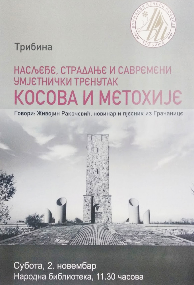У оквиру манифестације „Дучићеве вечери поезије“ у суботу, 2. новембра са почетком у 11.30, одржаће се трибина „Насљеђе, страдање и савремени умјетнички тренутак Косова и Метохије“