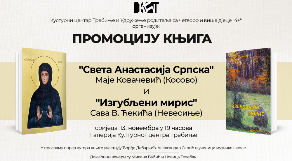 Kulturni centar Trebinje i Udruženje roditelja sa četvoro i više djece "4+", u srijedu 13. novembra u 19 časova u galeriji Kulturnog centra Trebinje organizuju promociju knjiga "Sveta Anastasija Srpska", autora Maje Kovačević sa Kosova i "Izgubljeni miris" Sava Đekića iz Nevesinja.
