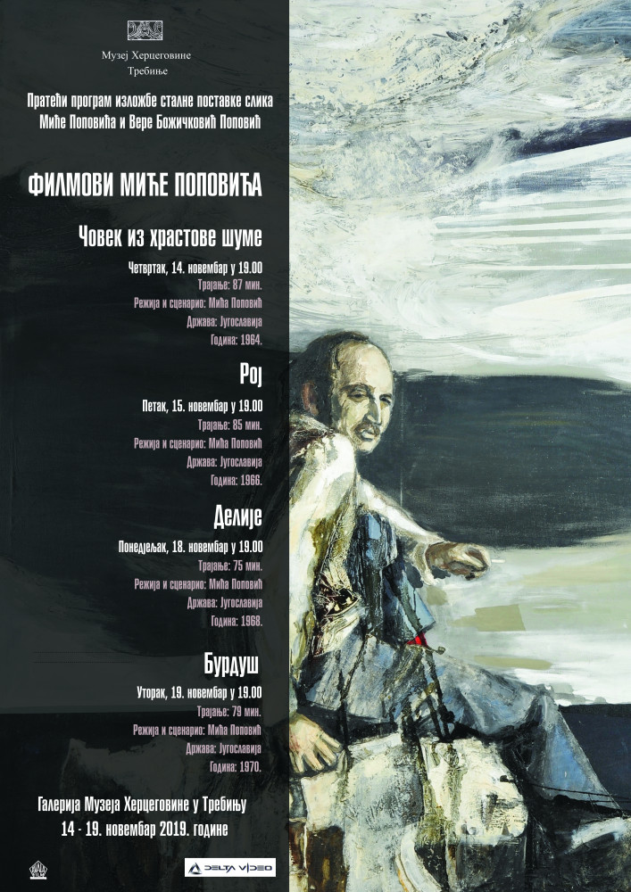 Projekcije u Galeriji Muzeja Hercegovine će biti organizovane kao prateći program izložbe stalne postavke slika Miće Popovića i Vere Božičković Popović, koja je realizovana u saradnji Centra za kulturu „Vuk Karadžić“ Loznica i Muzeja Hercegovine u Trebinju. Veliku zahvalnost dugujemo gospođi Marini Ivanović direktoru ''Avala filma'' i gospodinu Slavoljubu Gnjatoviću direktoru ''Delta videa'' iz Beograda, čijom ljubaznošću se projekcije filmova Miće Popovića po prvi put prikazuju trebinjskoj publici.