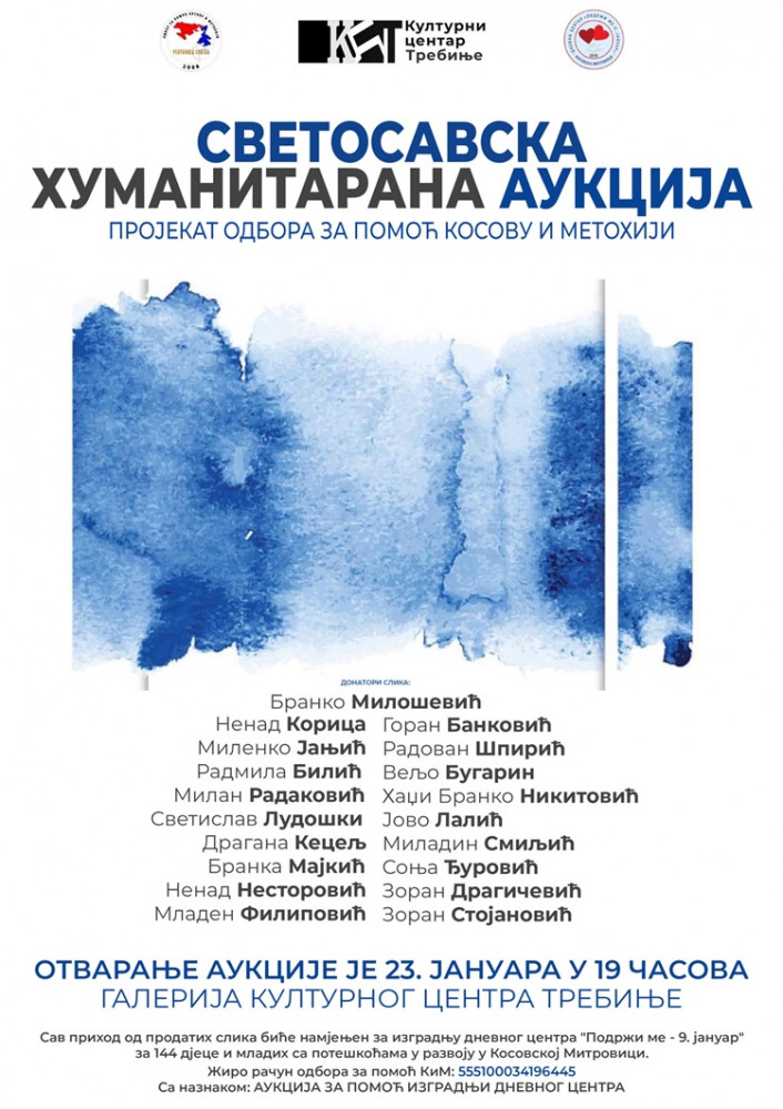 Grad Trebinje i Kulturni centar Trebinje, na inicijativu Odbora za pomoć Kosovu i Metohiji iz Republike Srpske u četvrtak, 23. januara u 19 časova u galeriji Kulturnog centra Trebinje organizuju Svetosavsku humanitarnu aukciju slika.