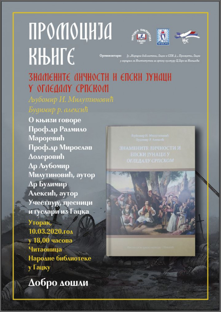 U utorak 10. marta, u prostorijama čitaonice Narodne biblioteke u Gacku biće predstavljena knjiga „Znamenite ličnosti i epski junaci u Ogledalu srpskom“, autora Ljubomira I. Milutinovića i Budimira R. Aleksića.