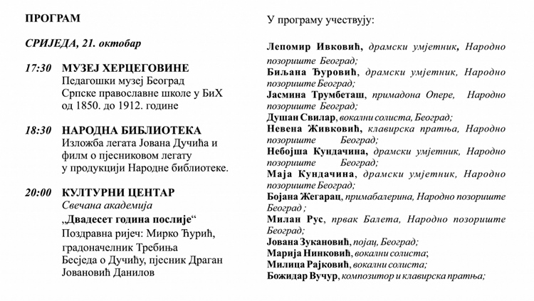 Nakon pozdravne riječi gradonačelnika Mirka Ćurića i Besjede o Dučiću pjesnika Dragana Jovanovića Danilova, biće održan bogat kulturnoumjetnički program, u kojem učestvuju poznati dramski, operski i baletski umjetnici, kao i vokalni solisti iz Beograda, te domaći izvođači Bobo Vučur, Marija Ninković i Milica Rajković.