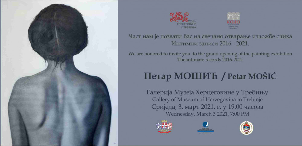 Srijeda, 3. mart 2021. godine, sa početkom u 19.00 časova, u Galeriji Muzeja Hercegovine u Trebinju, upriličiti otvaranje izložbe slika Petra Mošića, akademskog slikara iz Beograda. Izložba, koja će biti predstavljena publici od 3. do 31. marta, organizuje se kao nagrada umjetniku Petru Mošiću, koji je na Petoj međunarodnoj umjetničkoj koloniji KOLO 2020 proglašen, od strane stručnog žirija, za najboljeg učesnika kolonije. Izložba pod nazivom „Intimni zapisi 2016- 2021.“ sastoji od 17 slika, rađenih u tehnici ulje na platnu, iz privatnih zbirki, fundusa Muzeja Hercegovine Trebinje i Udruženja KOLO, organizuje se u saradnji Udruženja umjetnika „Međunarodna umjetnička kolonija KOLO“ iz Trebinja i Muzeja Hercegovine u Trebinju.