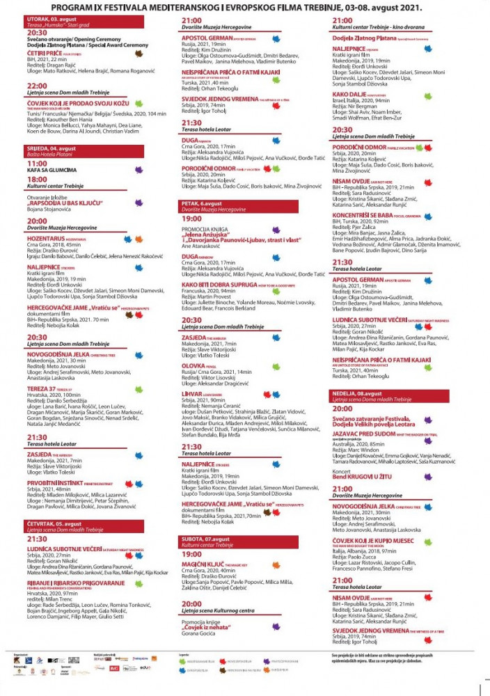 Do 08. avgusta na još četiri lokacije ( Kulturni centar Trebinje, Muzej Hercegovine i Terasa hotela Leotar) biće prikazano 26 dugometražnih, kratkih igranih i dokumentarnih filmova iz: BiH, Srbije, Crne Gore, Hrvatske, Makedonije, Švedske, Njemačke, Belgije, Francuske, Italije, Izraela, Albanije, Turske i Tunisa. Pored tradicionalnih programskih cjelina Festival od ove godine uvodi i novu - Dječiji program. Svakog festivalskog dana sa lokalnim vinarima družiće se, ove godine nešto brojniji, gosti Festivala. Neće izostati ni tradicionalna „Kafa sa glumcima“ u bašti Hotela Platani. Tokom Festivala biće priređene i promocije knjiga „ Jelena Anžujska“ i „ Davorjanka Paunović“, autorke Ane Atanasković i „Čovjek iza nehata“, Gorana Gocića, kao i izložba niškog slikara i muzičara Bojana Stojanovića. Posjetioci trebinjskog filmskog festivala i ovoga puta imaće i posebne muzičke ugađaje: na otvaranju nastupiće Nada Pavlović sa bendom, a posle Svečanog zatvaranja biće upriličen koncert trebinjskog rock sastava Krugovi u žitu.