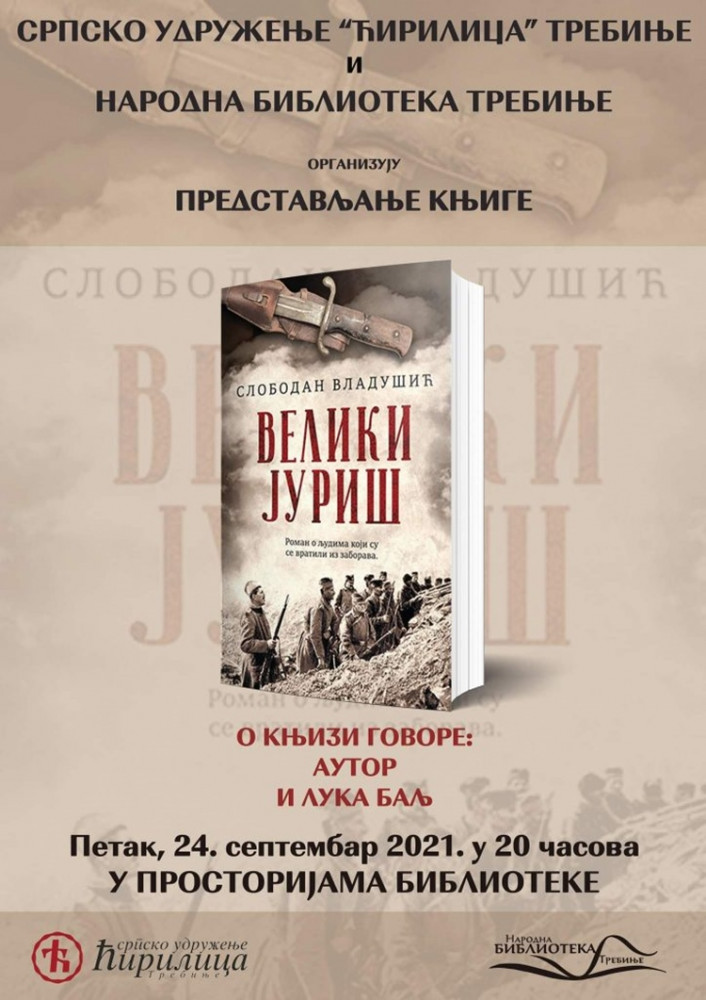 Srpsko udruženje „Ćirilica“ i Narodna biblioteka Trebinje sutra, u petak, 24. septembra organizuju predstavljanje knjige Slobodana Vladušića „Veliki juriš“.