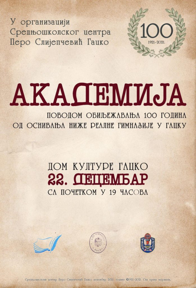 Srednjoškolski centar “Pero Slijepčević” Gacko, u srijedu 22. decembra, svečanom Akademijom obilježiće 100 godina od osnivanja Niže realne gimnazije u Gacku.