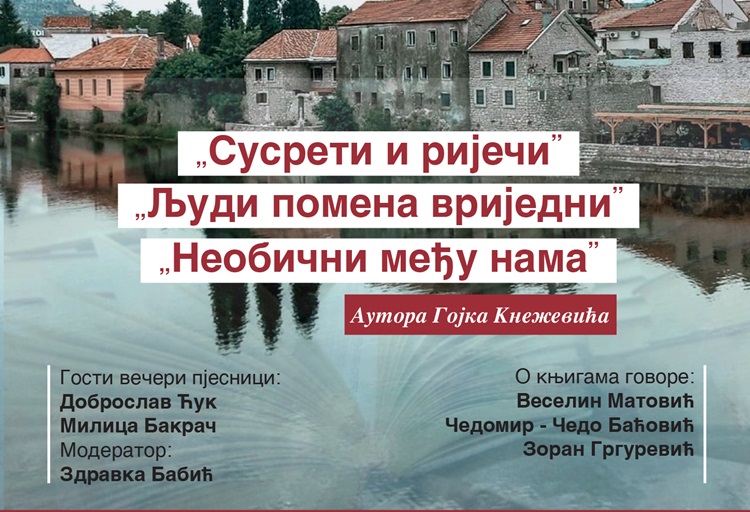 Trebinjskoj publici biće predstavljene dvije knjige reportaža: “Ljudi pomena vrijedni” i “Neobični među nama” te “Susreti i riječi”, izbor intervjua.