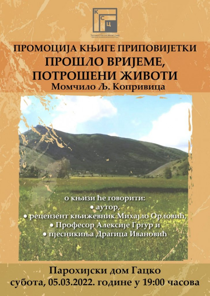 U subotu 05.03.2022 godine u 19.00 časova u Parohijskom domu u Gacku biće upriličena promocija knjige pripovijedaka Momčila LJ. Koprivice pod nazivom „Prošlo vrijeme, potrošeni životi“.