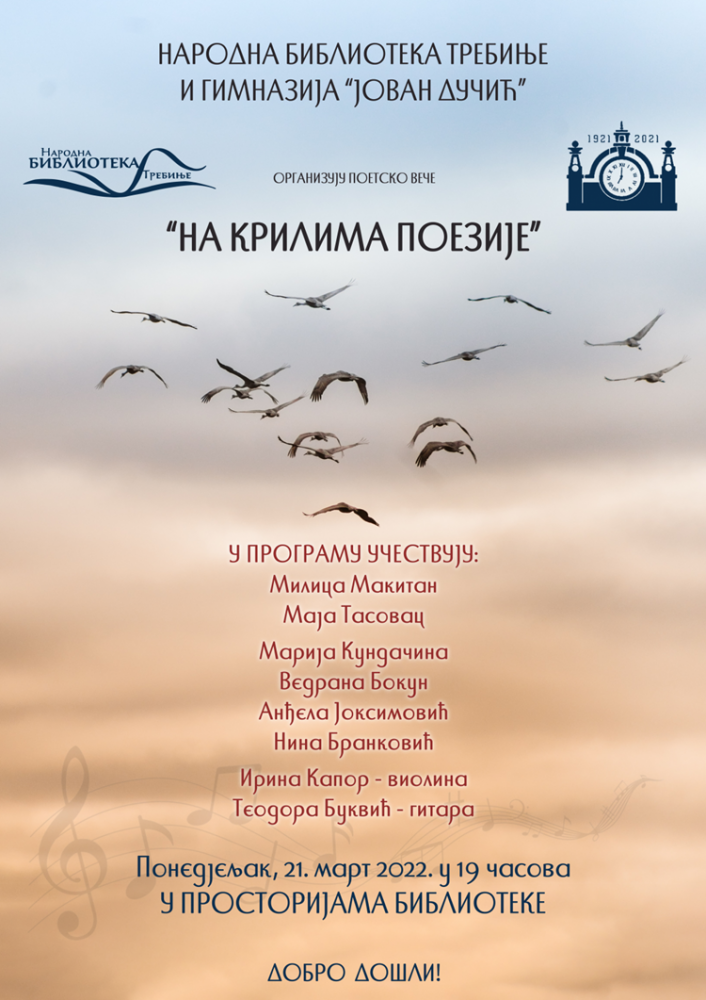 Narodna biblioteka Trebinje, u saradnji sa Gimnazijom „Jovan Dučić“, povodom Svjetskog dana poezije večeras organizuje poetsko veče „Na krilima poezije“.