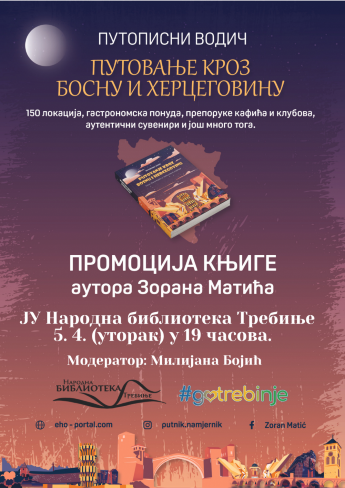 Narodna biblioteka, u ponedjeljak, 4. aprila organizuje promociju putopisnog vodiča „50 Top lokacija Bosne i Hercegovine“ autora Zorana Matića.